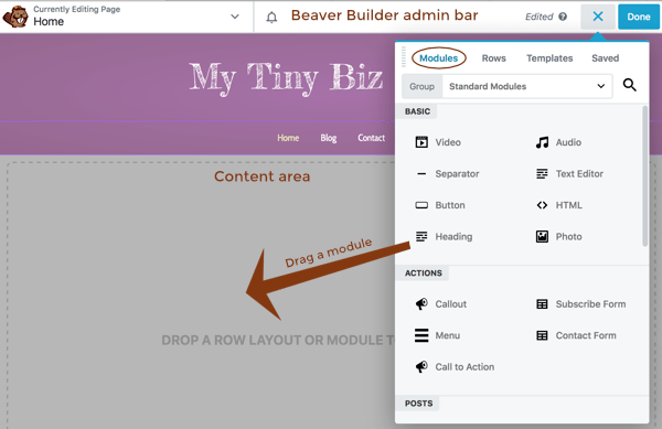 • Design your content from scratch by dragging individual modules into the content area. Click the Modules tab and drag a module into the layout.