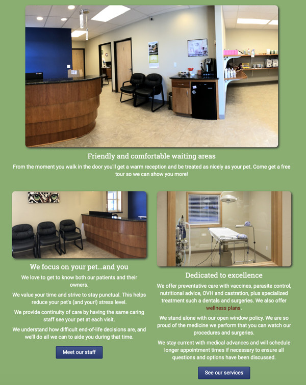 The callout module tends to be used in groups, often to highlight the features of a business that send the visitor to the appropriate page of the site. Here's an example of a grouping of Callout modules. Although you could construct the same look with a Photo module, Heading module, Text Editor module, and Button module, the Callout module keeps it of these parts together nicely on smaller devices, and it automatically adds the link to the image and the heading as well as to the button to facilitate getting to the right location.