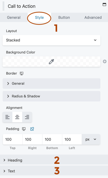 This tab has fields to enter the heading and text portion of the call to action. You can also specify the Heading tag that you want used (H1, H2, etc.). If you want to enter a custom font size, you can do that in the Typography section of the Style tab.