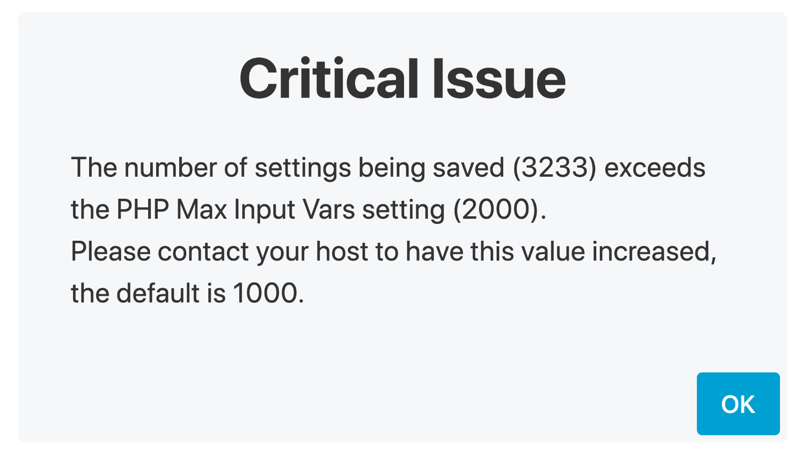 Most shared hosts won’t grant you full access to modify this value but your hosting provider can easily change the value for you. We recommnend that you ask them to increase max_input_vars to 5000.