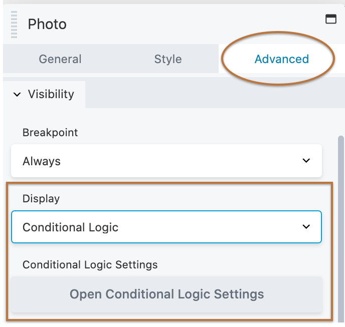 - Go to the Visibility section, and in the Display field, choose Conditional logic, then click Open Conditional logic settings.