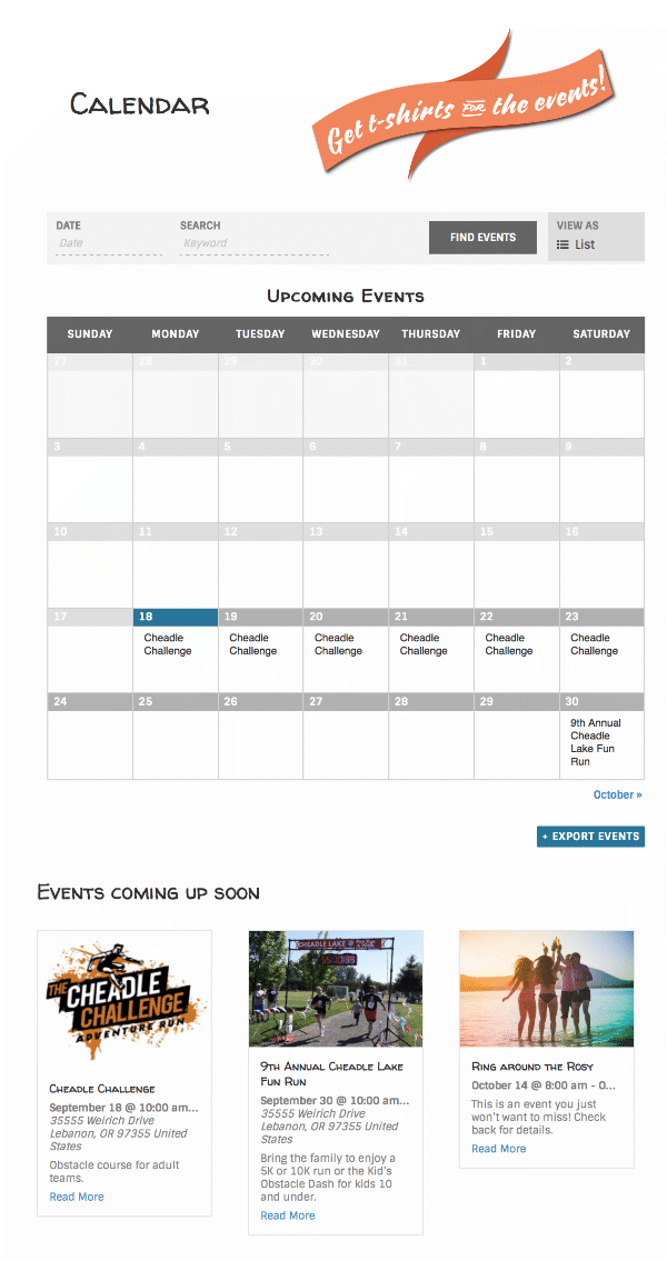 The advantage of using Themer layouts to build your events pages is that you have more flexibility in layout and style. For example, instead of displaying just the Month, List, or Day views on the Events page, you could add a banner, a heading, the calendar, and add a list of the next few upcoming events, as shown in this screenshot.