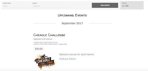 Clicking an individual event takes you to the single event page, which has all the details. This screenshot shows what the default single event page looks like: