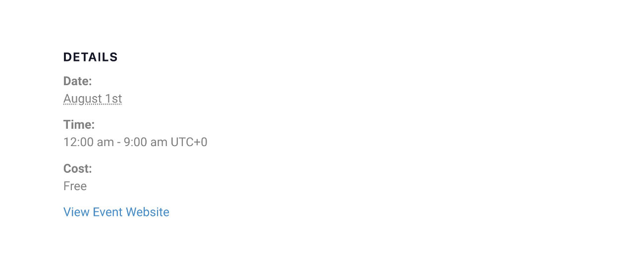 The Event Details module is a basic module which has no configuration or styling options and simply displays an event's details. An event's details content consists of date, time, cost, and a link to the event's website.